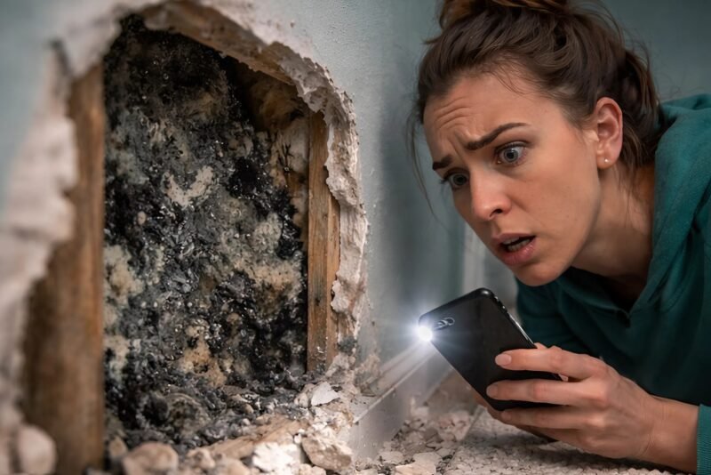 The entire space behind my daughter’s bed was covered in thick black stains. It wasn’t just ordinary dirt or dampness. A thick, fuzzy layer of black mold was growing on the wood and insulation. I immediately knew something was seriously wrong.